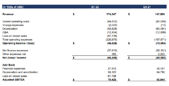 Scorpio Tankers成立于2009年,总部位于摩纳哥,于2010年在纽交所挂牌上市,是一家精炼石油产品运输的领先国际运营商。据其最新季度财报,Scorpio Tankers在今年一季度营收约1.74亿美元,同比增长29.7%;息税折旧摊销前利润EBITDA环比上涨,几乎追平前年三季度的表现。