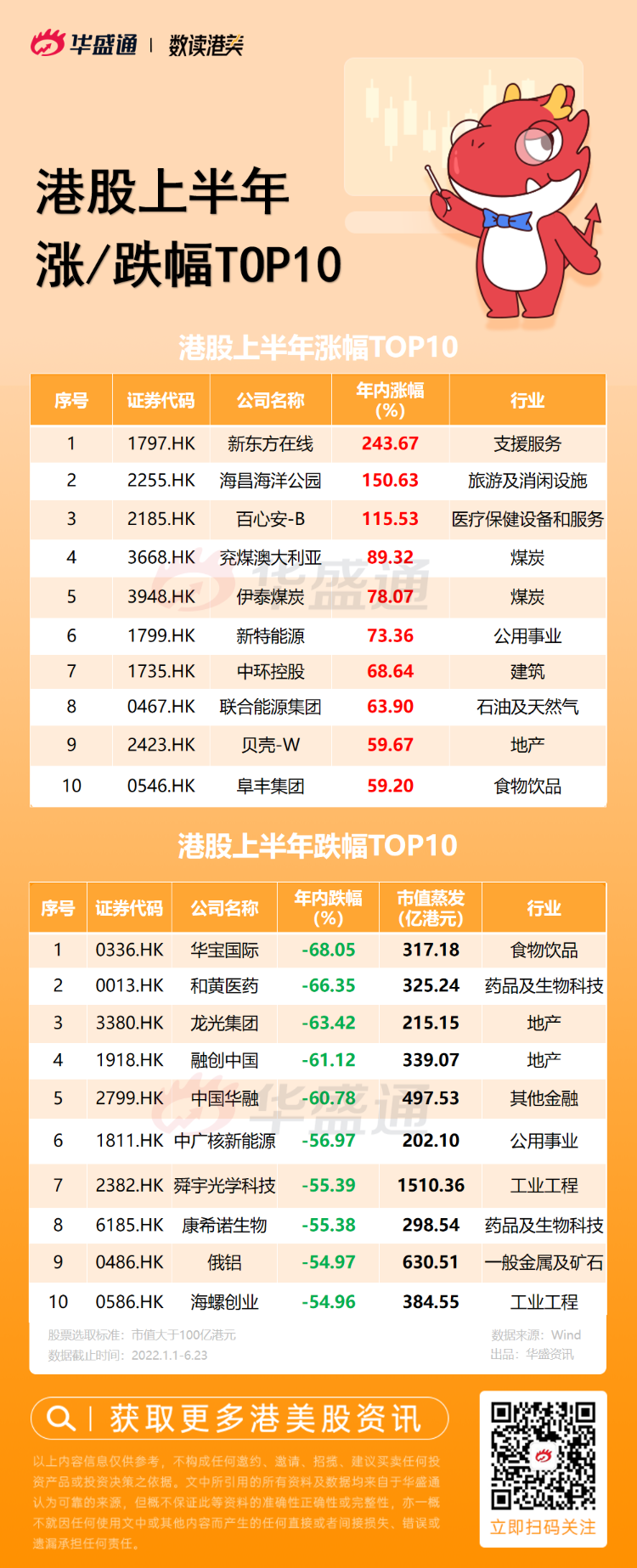 回顾2022上半年,涨幅榜登顶榜首的莫过于近期双语直播带货出圈的新东方在线。此外,海昌海洋公园、百心安也荣登港股涨幅榜前三甲。