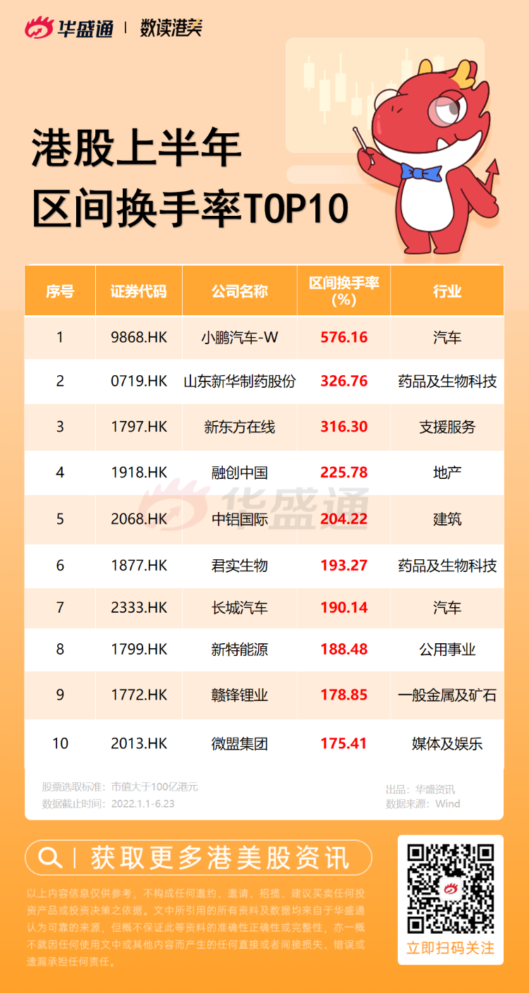 换手率又称“周转率”,是衡量一只股票交易是否活跃的重要指标之一。100亿市值以上的港股中,小鹏汽车区间换手率超576%,稳居榜首。此外,山东新华制药股份、新东方在线、融创中国等区间换手率也稳居前列。