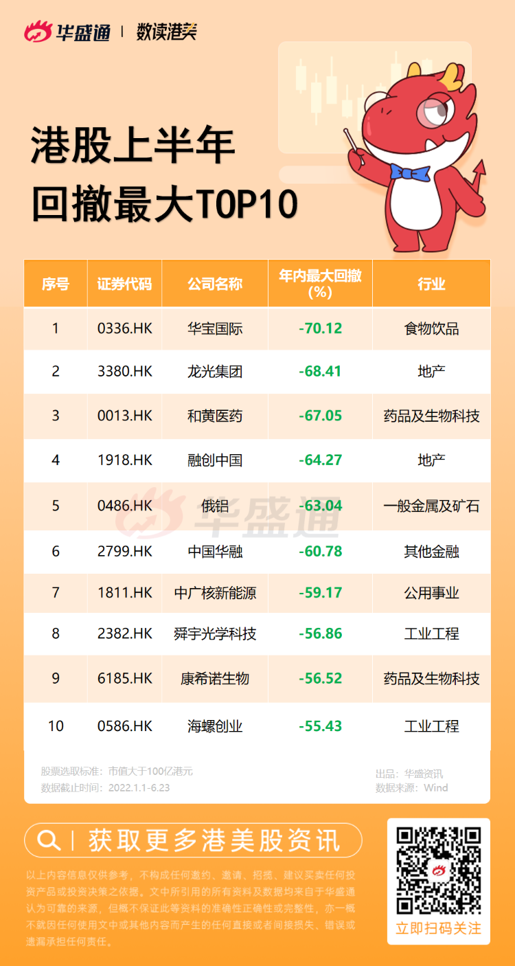 实控人被查,股价遭遇双杀,华宝国际上半年大幅回撤位居榜首。此外,龙光集团、和黄医药、融创中国、俄铝等均大幅回撤超60%。