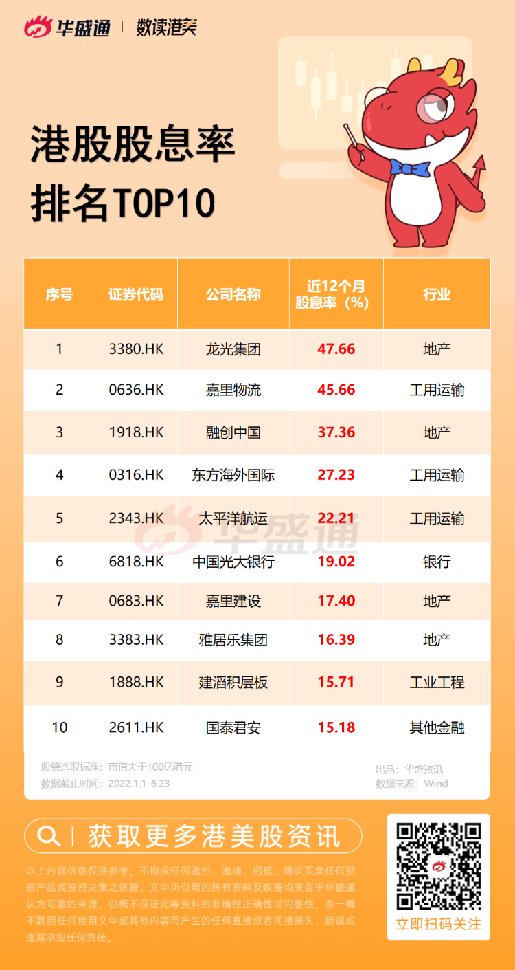 在港股市场,高息股一向备受投资者青睐,股息率体现了公司管理层对于公司的信心以及对股东的慷慨程度,同时大部分稳定分红派息的公司经营状况良好。港股市场股息率历史均值在3.36左右,对比全球主要国家市场处于较高的水平。近12月来,龙光集团以47.66%股息率登顶榜首。此外,嘉里物流、融创中国、东方海外国际等均是高股息港股。