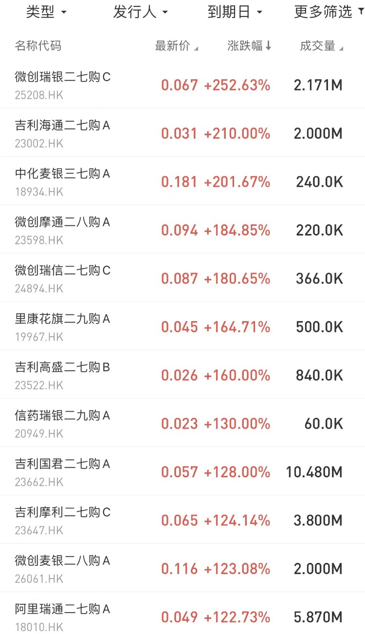 在今日涨幅榜中,居前包括:微创瑞银二七购C $25208.HK 涨252.63%,吉利海通二七购A $23002.HK 涨210%,里康花旗二九购A $19967.HK 涨201.67%。