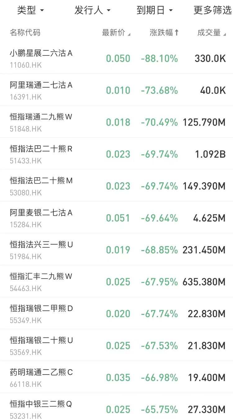 在今日跌幅榜中,小鹏星展二六沽A $11060.HK 跌88.10%,阿里瑞通二七沽A $16391.HK 跌73.68%。