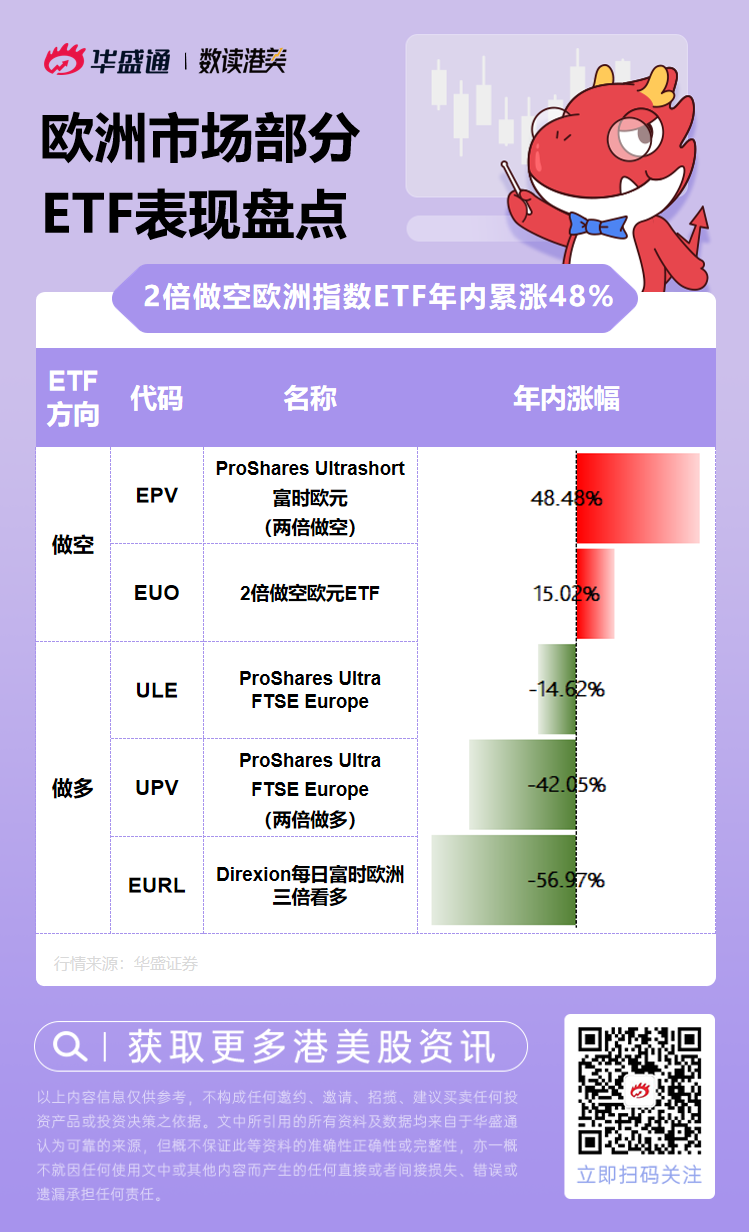 体现在美股ETF方面,截至本周四收盘,2倍做空欧洲市场的ETF $EPV ProShares Ultrashort富时欧元年内累计涨幅已达48.48%,2倍做空欧元ETF $EUO 累计涨幅则达到15.02%。做多ETF年内表现多数不佳。