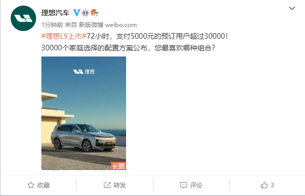 24日晚消息,理想汽车宣布,理想L9订单量已超过3万辆。