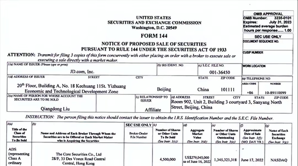 6月17日,刘强东减持京东价值约2.79亿美元股票(约合人民币18.71亿元)。