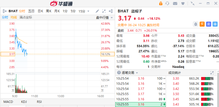 华盛资讯6月24日消息,继昨日收涨263%之后,今日中概股蓝帽子继续领涨,开盘后一度涨近40%,截至发稿,涨幅收窄至16.12%。热门中概股多数上涨,BOSS直聘涨近10%,百济神州涨8.5%,百胜中国涨近8%,京东、小鹏汽车涨超4%,台积电、阿里巴巴、蔚来汽车、理想汽车涨超2%。
