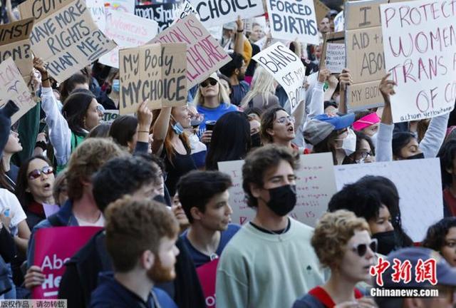 当地时间6月24日,美国联邦最高法院推翻确立堕胎权的判例“罗诉韦德案”后,美国民众举行抗议活动。