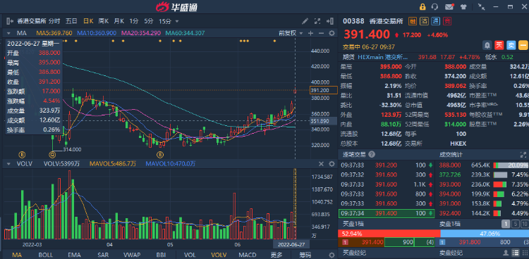 华盛资讯6月27日讯,港交所(00388)早盘涨近5%,截至发稿,涨4.6%,报391.4港元,成交额12.61亿港元。