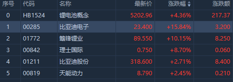 华盛资讯6月27日讯,港股锂电池板块持续冲高,比亚迪电子涨超15%,赣锋锂业涨超10%,比亚迪股份涨近3%,天能动力涨超2%。