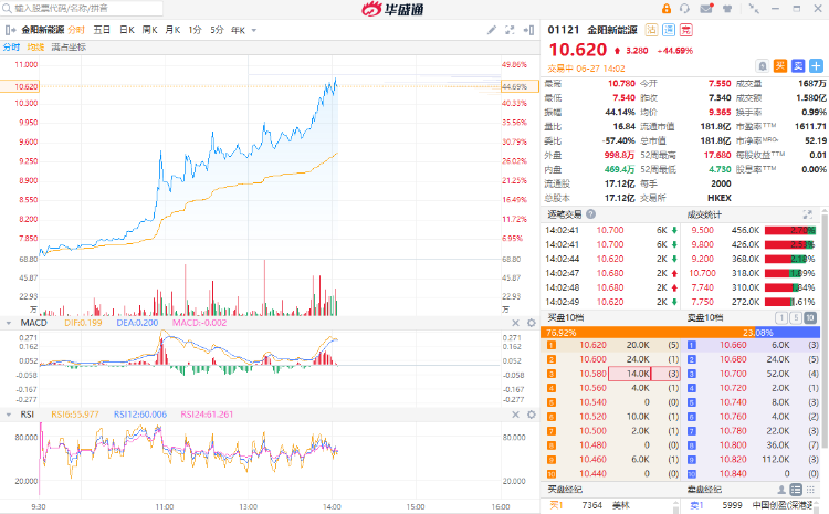 华盛资讯6月27日消息,金阳新能源午后拉升走强,截至发稿,涨44.69%,报10.62港元每股,成交额1.58亿港元。