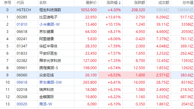 今日港股延续上周涨势,继续冲刺,截至发稿恒生科技指数涨幅扩大至4.3%,重回5000点上方,成分股小米集团涨10%,京东、美团涨约4%,恒生指数涨超2.39%,恒指也重回22000点上方。