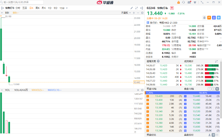 华盛资讯6月29日消息,快狗打车上市后连续第四日下跌,午后一度跌近10%,低见13.06港元,较招股价21.5港元已跌近40%。截至发稿,跌7.31%,报13.44港元,成交额5713万港元。