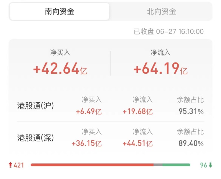 南下资金今日净买入港股42.64亿港元,其中港股通(沪)净买入6.49亿港元,港股通(深)净买入36.15亿港元。上一交易日净买入港股30亿港元。