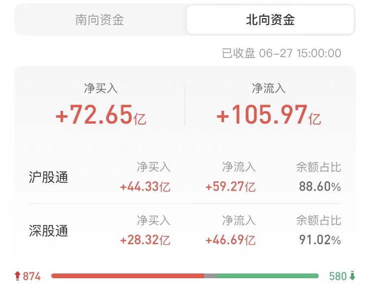 北上资金今日净买入72.65亿元,沪股通净买入44.33亿元,深股通净买入28.32亿元。上一交易日净买入96.17亿元。