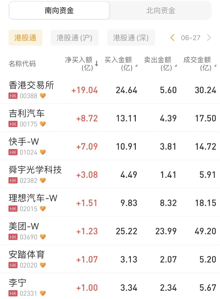 南下资金净买入港交所19.04亿港元,为今日买入之最。北水增持吉利想汽车8.72亿港元。此外,南下资金净买入快手7.09亿港元,净买入舜宇光学科技3.08亿港元。理想汽车、美团等也获加仓。