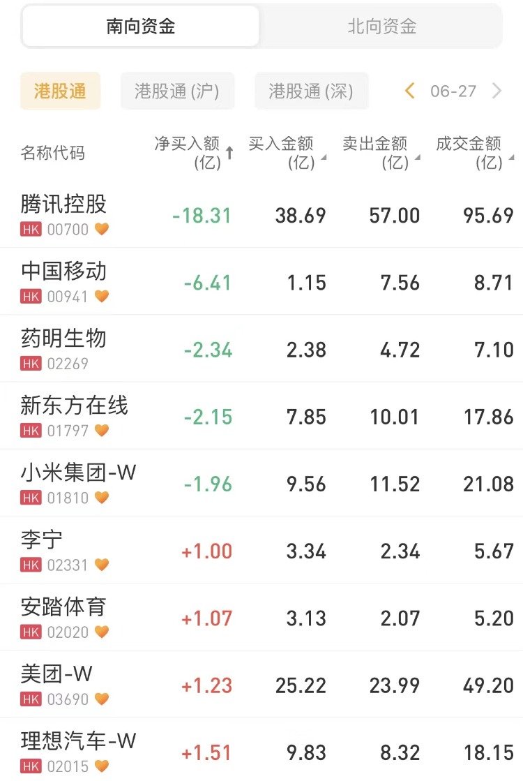 南下资金净卖出腾讯控股18.31亿港元,为今日卖出之最,净卖出中国移动6.41亿港元。