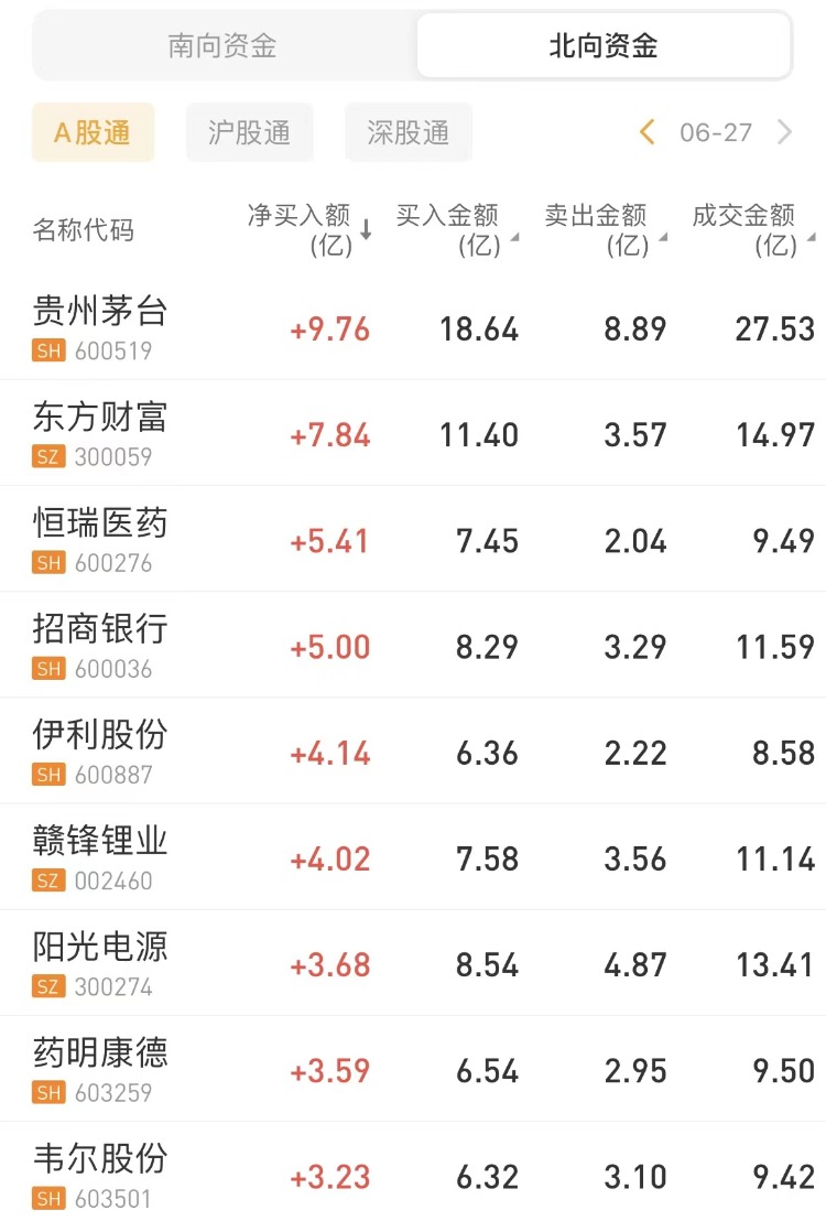 北上资金今日净买入贵州茅台9.76亿元,为今日买入之最;净买入东方财富7.84亿元。
