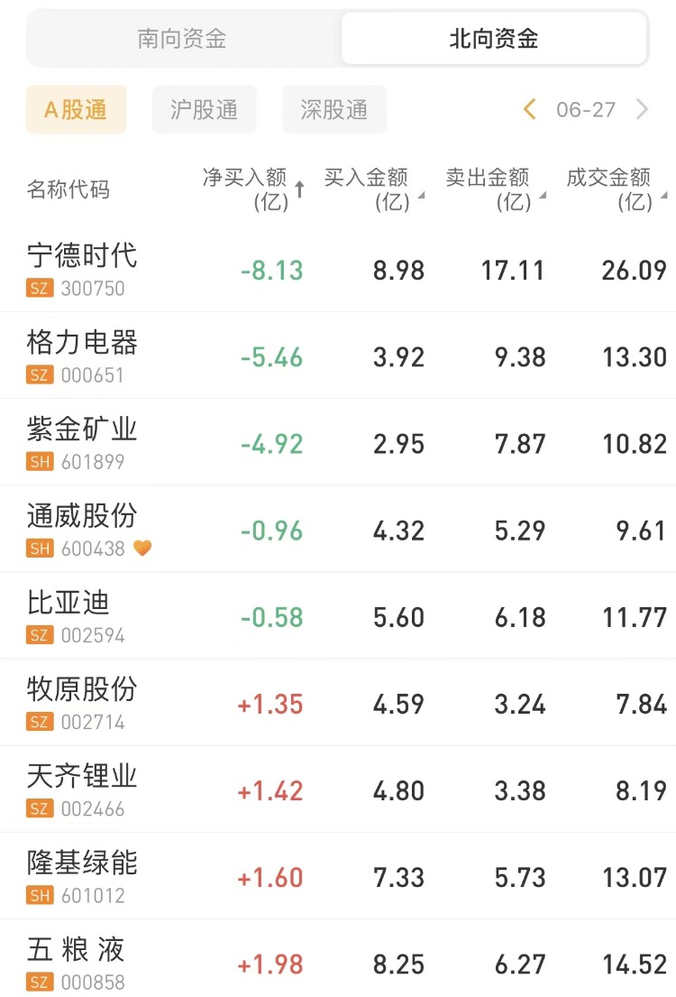 今日北上资金净卖出宁德时代8.13亿元,格力电器遭净卖出5.46亿元。