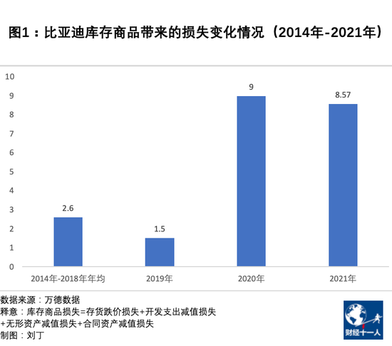 2019年到2021年,比亚迪库存商品账面价值从101亿元攀升到177.9元。同时比亚迪的存货跌价损失、开发支出减值损失、无形资产减值损失、合同资产减值损失总额,从2019年的1.53亿元提升到2020年的9亿元、2021年8.57亿元。这比2014年到2018年5年间年均2.6亿元水平高了三倍半。