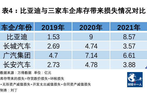 根据《财经十一人》测算,2020年到2021年,比亚迪的存货跌价损失、开发支出减值损失、无形资产减值损失、合同资产减值损失(计入资产减值损失项目),导致比亚迪净利润率降低了0.5个百分点和0.4个百分点。