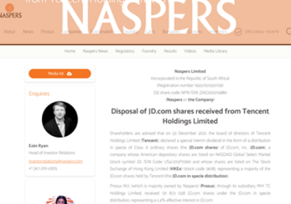 6月27日,Naspers 也在其官网发布声明,称将出售从腾讯公司中所获得的京东股票。据声明,2021年12月23日,腾讯控股有限公司(腾讯)董事会宣布以实物分配形式发放京东A类普通股的特别中期股息。Prosus N.V.(由Naspers控股)通过其子公司MIH TC Holdings Limited获得约1.32亿京东股份,约占4%的京东实际股份权益。Naspers表示,由于京东不属于公司的战略核心重点。Prosus在公开市场上有序处置京东股份。出售于2022年6月24日完成,不受任何先决条件的约束,出售所得款项总额约36.7亿美元。