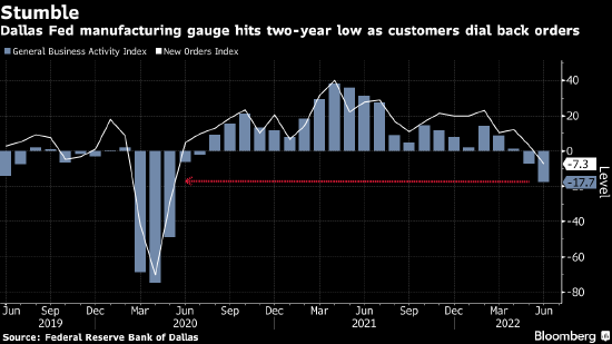 一项衡量德克萨斯州制造业活动的指标6月跌至两年低点,与近期其他联储辖区报告的经济情况相符,后者显示生产商面临高通胀,需求疲软及供应问题。