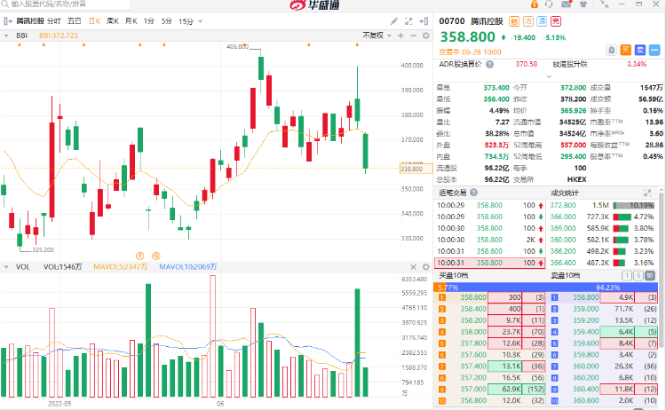 华盛资讯6月28日消息,受最大股东计划减持影响,继昨日由升转跌后,腾讯今日盘中继续下跌,一度跌超5%至356.4港元。