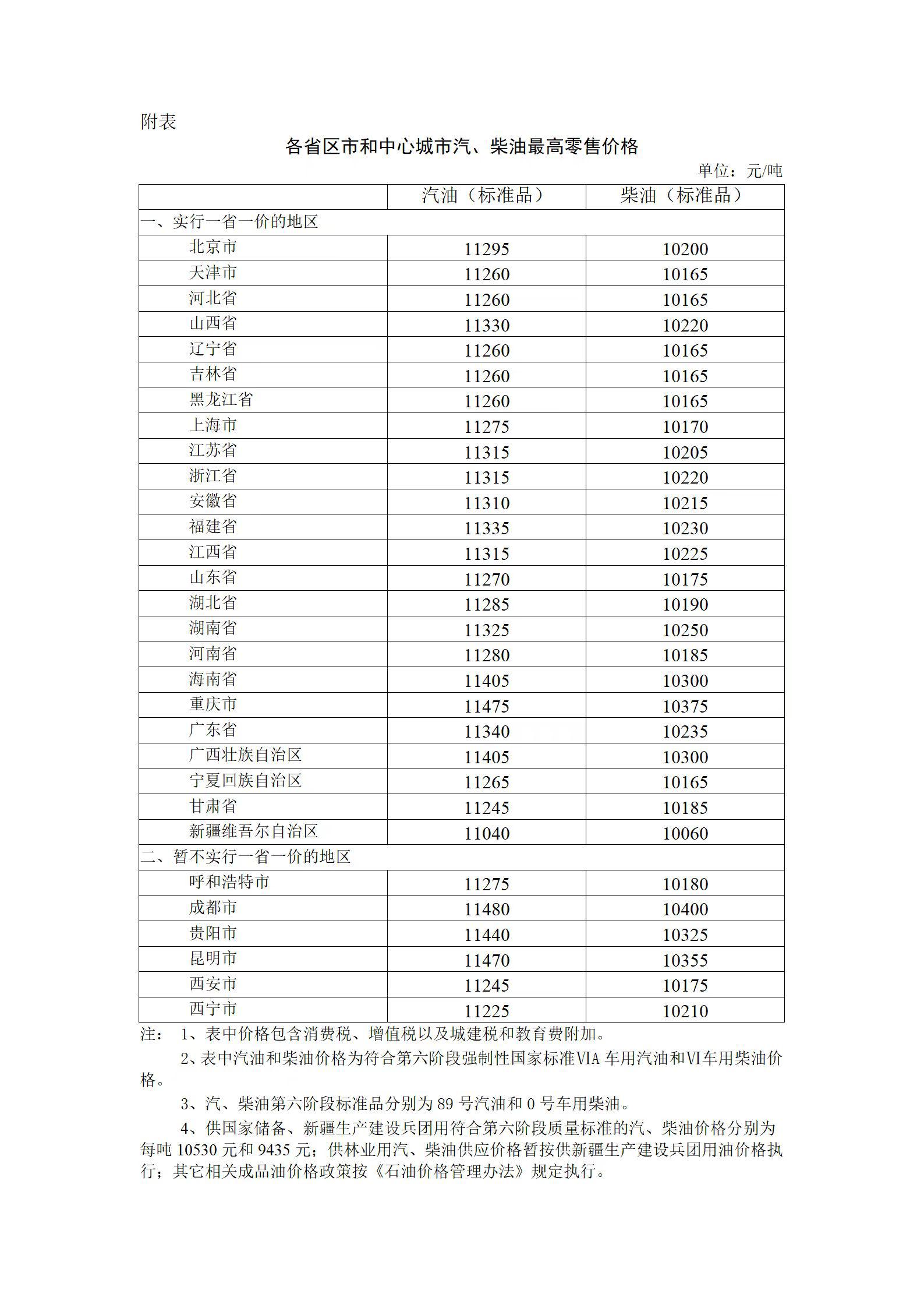据发改委官网,调整后,各省(区、市)和中心城市汽、柴油最高零售价格见附表。相关价格联动及补贴政策按现行规定执行。