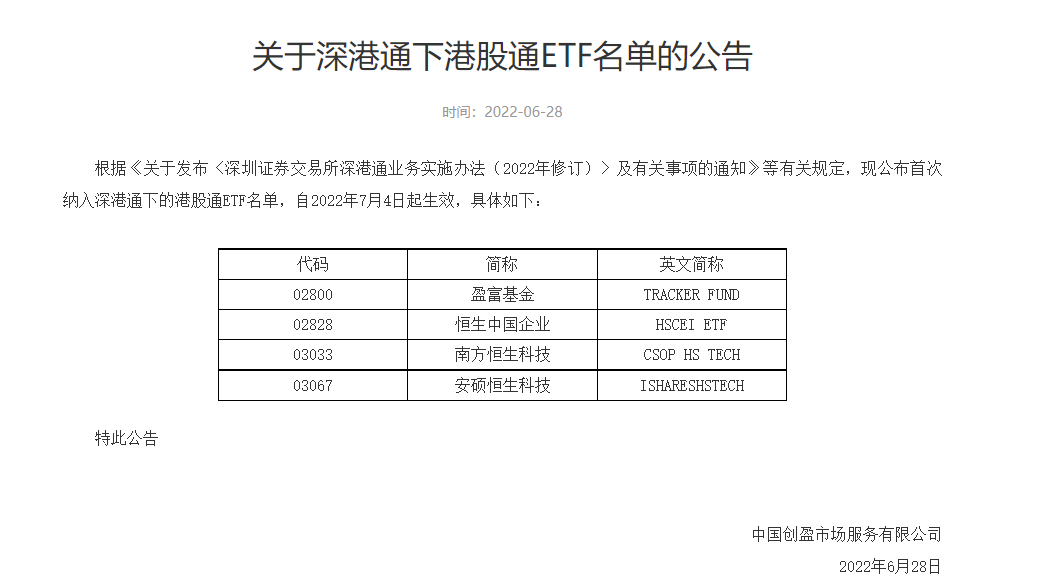 深交所和香港联交所今日公告了首批深港通标的ETF名单,将于7月4日正式纳入深港通标的范围。其中,深股通ETF共30只,覆盖创业板ETF、沪深300ETF等核心宽基产品,以及生物科技ETF、芯片ETF、碳中和ETF等代表性行业主题产品,主要集中在先进制造、数字经济和绿色低碳等领域。港股通ETF共4只,包括盈富基金等股票ETF。市场参与者可在深交所和香港联交所网站上查阅深港通标的ETF的具体名单。