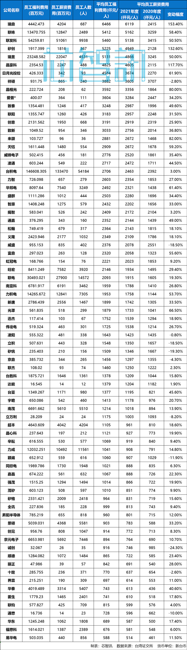 根据芯智讯在台湾证交所查询到约76家台湾半导体类上市公司员工福利及薪资数据显示: