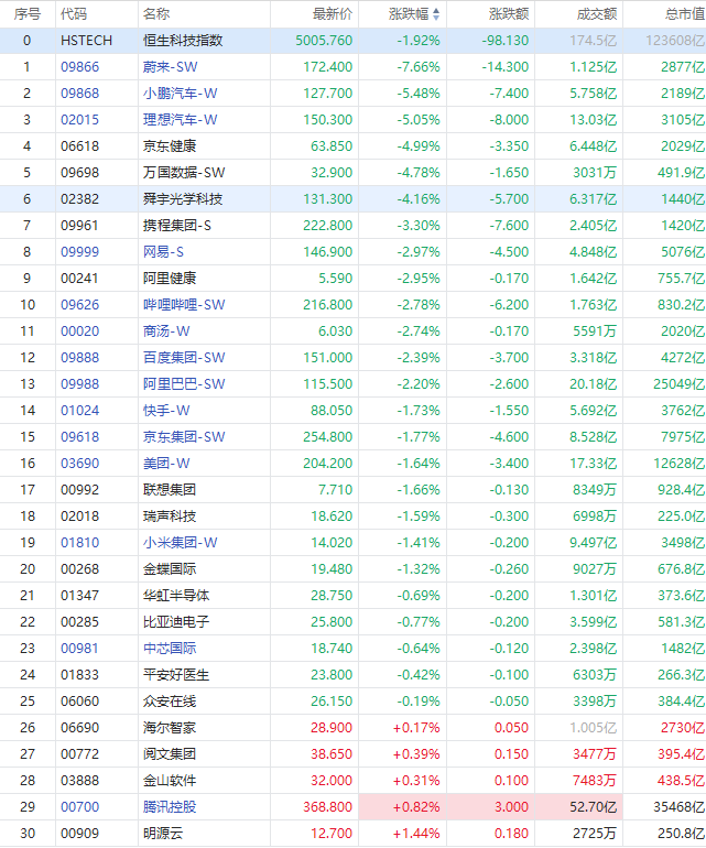 盘面上汽车股普跌,蔚来跌7.66%,报172.4港元每股,成交额1.125亿港元,小鹏汽车跌超5%,理想跌5.05%。科网股多数走弱,哔哩哔哩、网易跌近3%,阿里跌2.2%,美团、快手、小米跟跌逾1%,腾讯涨0.82%,报368.8港元每股。