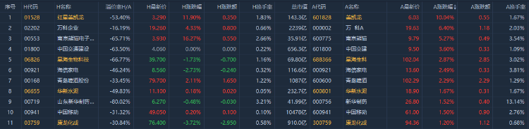 截止A股收盘,AH股涨幅前10如下: