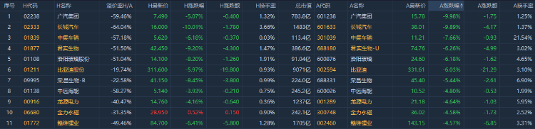 广汽集团A股跌停,H股跌5.07%;长城汽车A股跌9.89%,H股跌10.01%;中集车辆A股跌7.66%,H股跌6.18%。