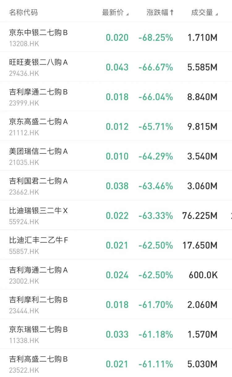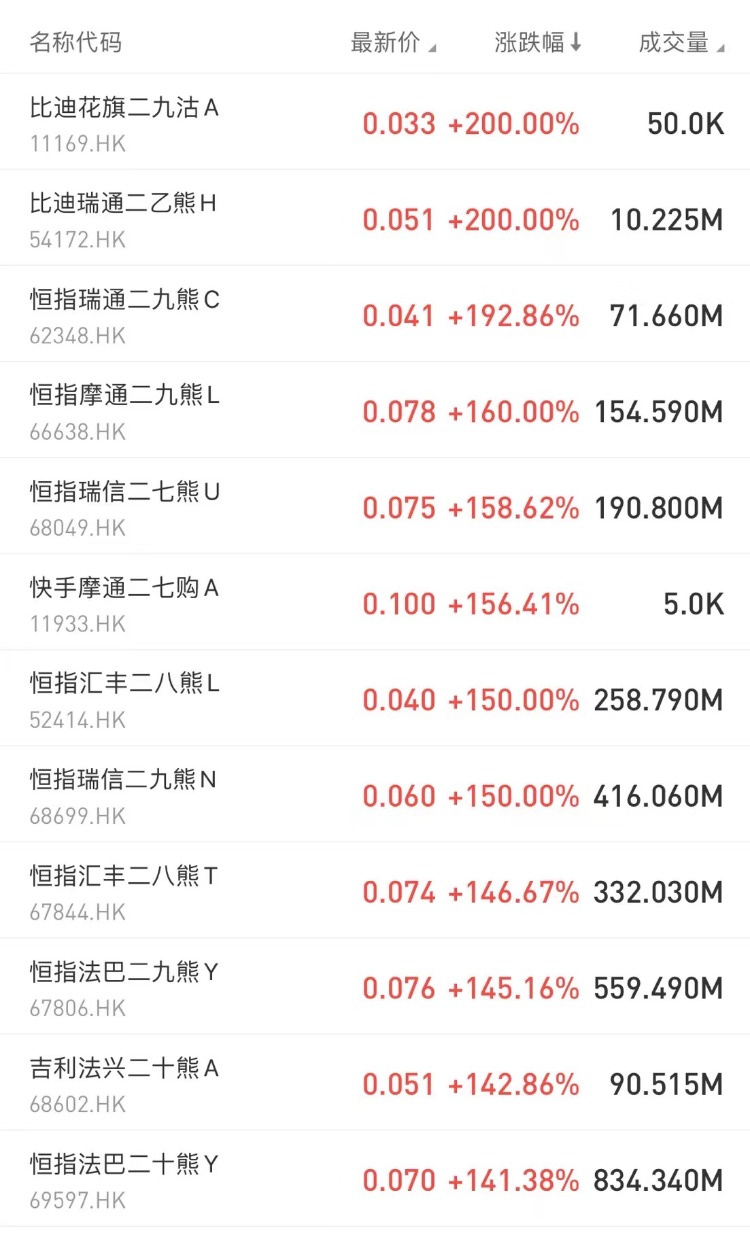 在今日涨幅榜中,居前包括:比迪花旗二九沽A $11169.HK 涨200%;恒指瑞通二乙熊H $62348.HK 涨200%;快手摩通二七购A $11933.HK 涨156.41%