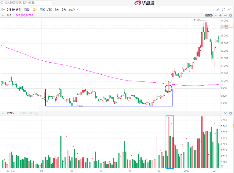小米在上市后股价持续低迷,一度在8港元附近徘徊了4个多月。但到了2019年12月11日,股价大涨近9%突破了这4个月的整理区间,且放出巨量,成交额超42亿港元。在后面两个交易日,这种量能得到了确认。在随后的一个月内,小米股价升至14港元,涨幅近50%。
