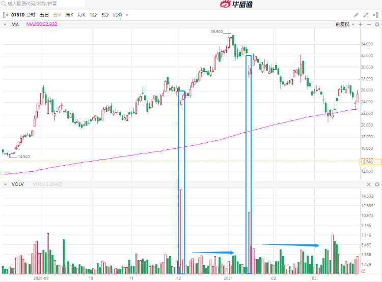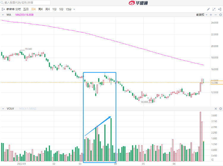 我们通过复盘小米此前的走势来简要分析一下,量价关系在走势中发挥的作用。