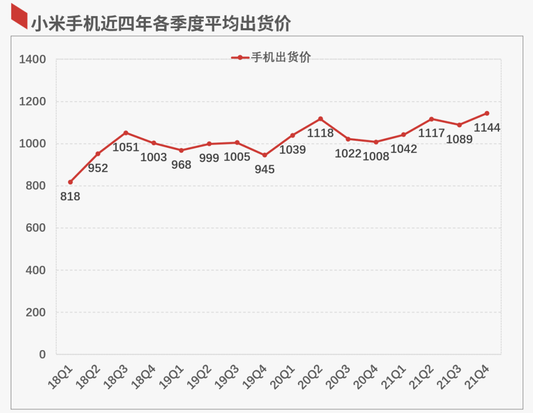 小米从小米10系列开始高端化之路,到12系列更是直接对标苹果,显示了小米继续高端化的决心。2021年,小米售价3000元人民币(300欧元)以上的高端机型占总出货量提升至13%,相比2020年7%的占比有近乎翻倍的表现。2021年Q4,小米平均出货价升至1144元,创出历史新高。