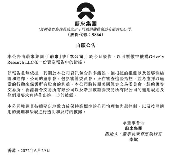 针对灰熊发布做空报告,6月29日,蔚来汽车方面公开回应称,“公司已观察到这份报告。该报告内容充满了大量不实信息以及对蔚来披露信息的误读。蔚来一直严格遵守上市公司相关准则,目前已针对该报告启动相关程序,请关注后续公告。”