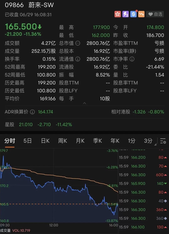 港股方面,截至6月29日收盘,蔚来(HK09866,股价165.9港元,市值2894亿港元)报165.9港元/股,股价跌幅为11.14%,一日内市值蒸发了358.7亿港元(约合人民币306亿元)。
