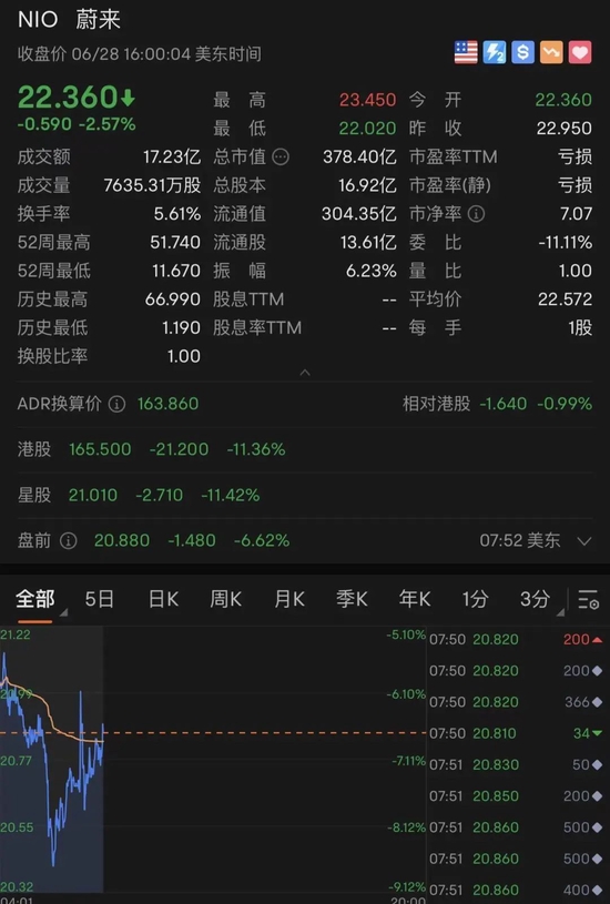 值得一提的是,虽然蔚来对上述做空报告予以否认,但其股价或已受到影响。美东时间6月28日,蔚来(NIO,股价22.36美元,市值373.53亿美元)股价一度跌至22.02美元,但随后股价企稳,收盘报22.36美元/股,跌2.57%;截至发稿,美股盘前已下跌6.62%。
