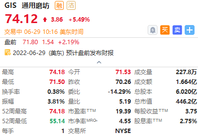 通用磨坊盘初涨超5%,周三公布第四财季调整后每股收益为1.12美元,高于去年同期的0.91美元。