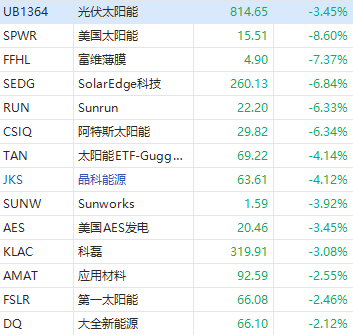 美股太阳能板块续跌,SunPower跌超8%,阿特斯太阳能、Sunrun跌超6%,晶科能源跌超4%,Sunworks跌超3%。