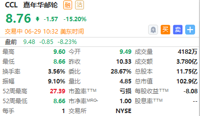 嘉年华邮轮盘初跌超15%,此前公布财报,遭多家大行下调目标价。其中,摩根士丹利表示,鉴于嘉年华的债务水平,面对另一次需求冲击,价格可能会跌至零。