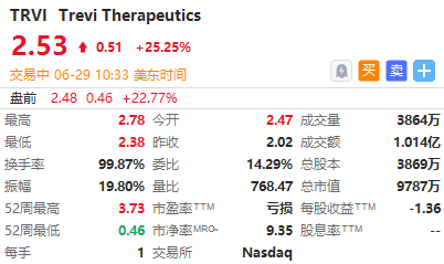 Trevi $TRVI 治疗公司股价上涨25%,此前该公司宣布其治疗结节性瘙痒的2b/3期PRISM试验取得积极结果。