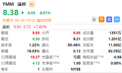 满帮高开低走,现跌超9%,公司此前表示,即日起恢复“运满满”、“货车帮”的新用户注册。