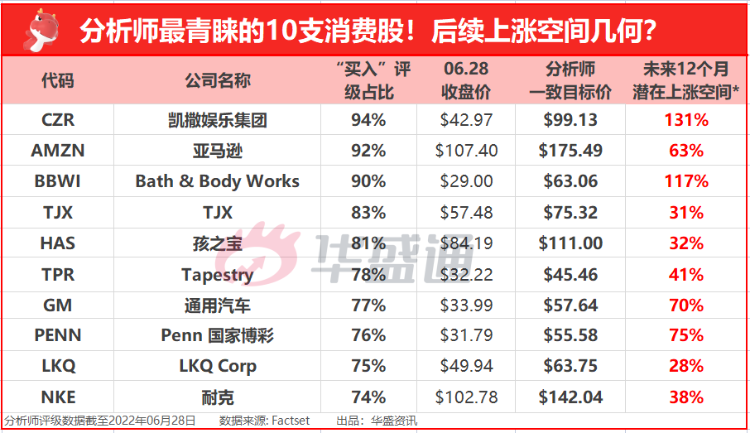 分析师预测未来12个月内消费板块将大涨!凯撒娱乐集团涨131%,Bath&Body Works涨117%, 亚马逊涨63%。