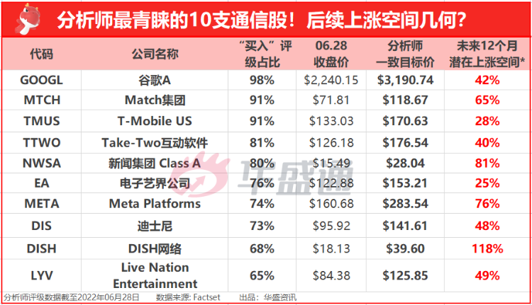 以下是标准普尔500指数中分析师最看好的10只通讯股的评级百分比: