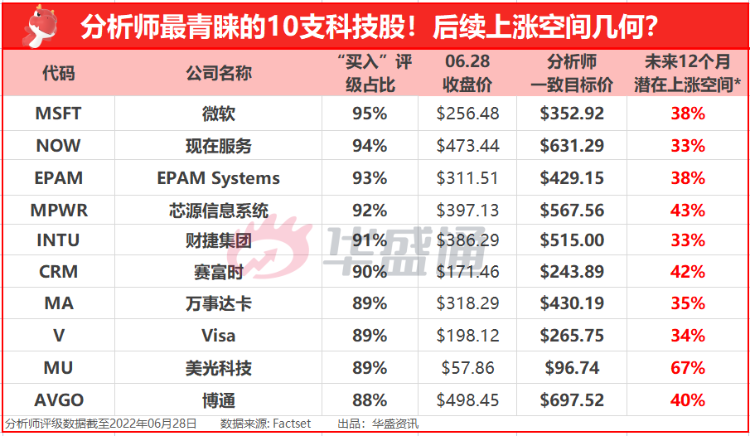 根据FactSet对目标价中值的权重,标普500指数科技股排名第三,分析师认为其上涨潜力高达37%。 以下是华尔街分析师最喜欢的10只科技股,按华尔街对后市“买入”评级占比百分比排名: