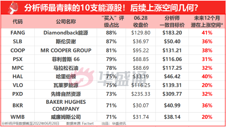 尽管能源板块今年以来大涨37%,但其预期市盈率却下降了30%。 以下是标普500指数中分析师最青睐的10只能源类股,按“买入”评级占比百分比排名: